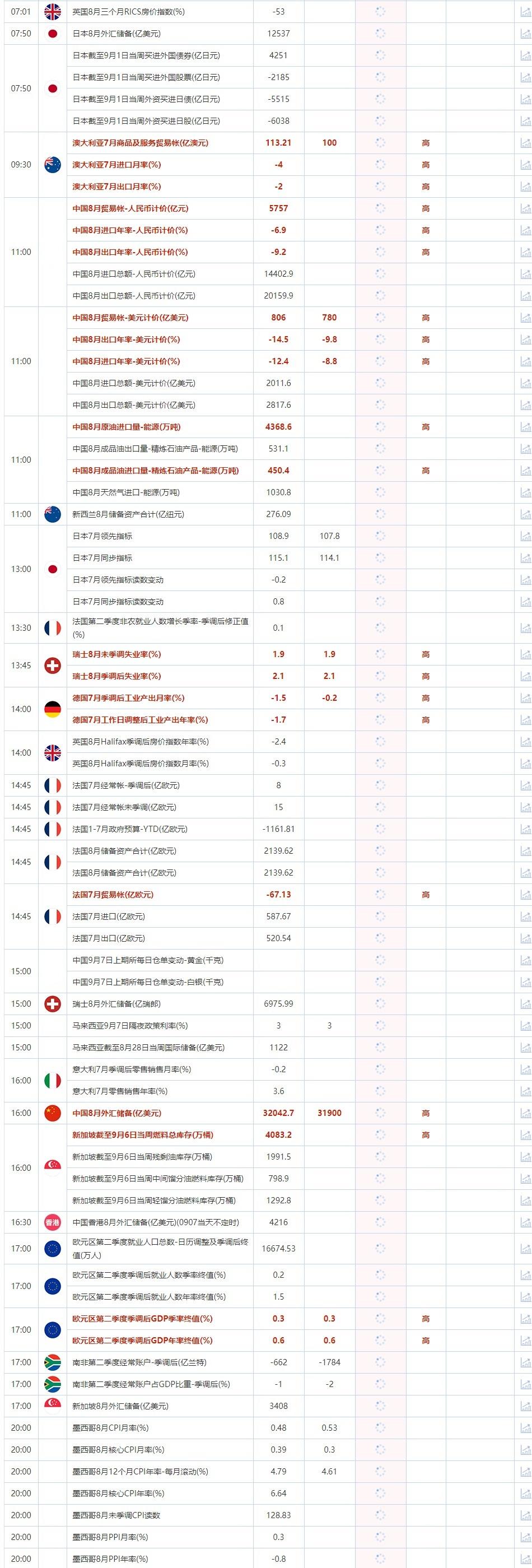 11:00 中国8月贸易帐-人民币计价(亿元) , 前值 5757 , 预期值 -- , 公布值:待发布11:00 中国8月进口年率-人民币计价(%) , 前值 -6.9 , 预期值 -- , 公布值:待发布