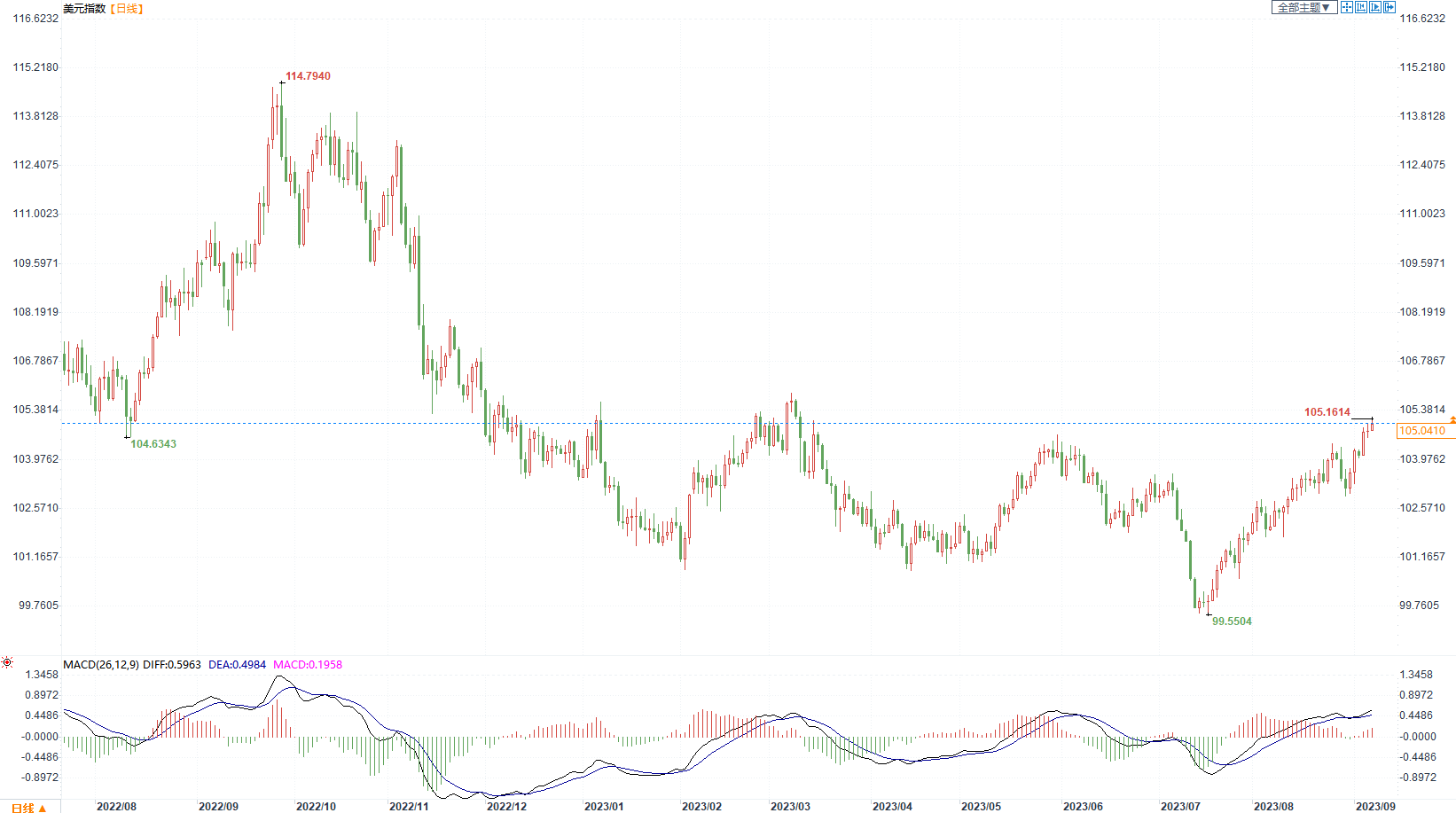 周四(9月7日)纽约时段,由于经济强劲引发人们对美联储将维持高利率的猜测,美元延续涨势,推动美元迎来多年来最长的涨势。美元指数现报104.96。