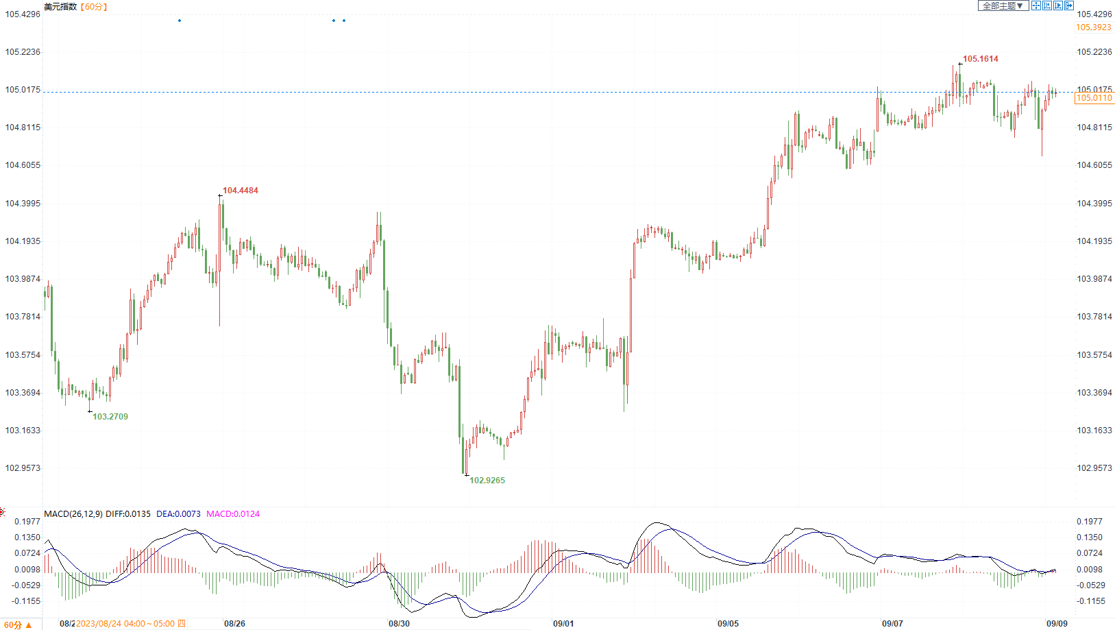 周五(9月8日)纽约时段,由于美联储官员表示央行不会在9月货币政策会议上进一步加息,美元涨势受阻,美元指数现报104.99。但美元仍连续第八周上涨,这是自 2005 年以来最长的连续上涨趋势。