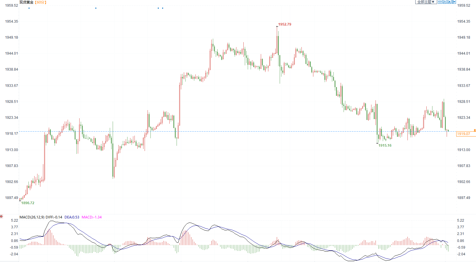周五美元从高点回落,金价延续反弹,攀升至近1,930美元后出现波动。截至发稿,现货黄金报1919.36美元/盎司,日内微跌0.01%。