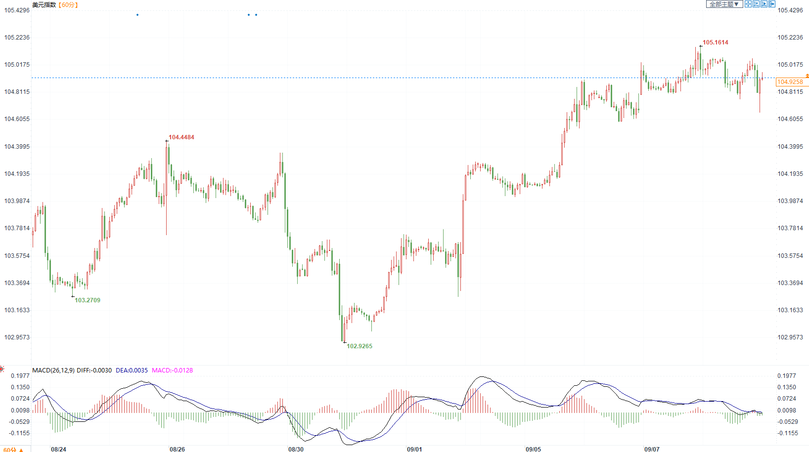 周五9月8日,由于美国经济数据强劲,令美联储激进加息周期的结束受到质疑,美元迎来九年来最长的单周上涨势头。截止发稿,衡量美元兑主要货币的美元指数下跌0.05%,至105,但与前一交易日的六个月高点105.15相距不远。该指数有望连续第八周延续涨幅,迄今为止已上涨0.7%。
