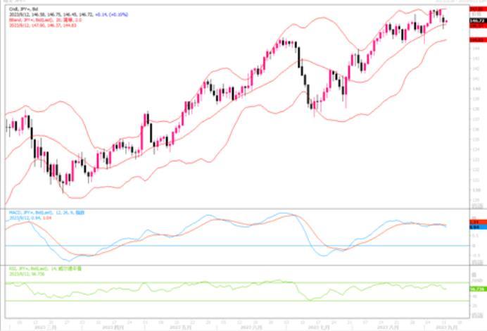 周一(9月11日),由于日本央行总裁发表鹰派讲话,美元/日元跌0.84%,收盘在146.58,盘中一度最低至145.90。周一日本央行总裁植田和男表示,如果日本央行确定可以实现通胀目标,就可能结束负利率政策。Oanda驻纽约高级市场分析师Edward Moya在谈到植田和男的言论时说:“这似乎表明,如果出现重大转变,他们可能更接近于在年底放弃负利率政策,但我们还有很长的路要走。”可以看到,日本央行还是实施老一套的做法,在当前美国经济发展强劲推动的交易情势下,日本央行并不想真金白银的浪费弹药,还是仅仅停留在口头警示的层面上,企图阻遏日元的快速贬值。而历史的过往也往往验证了 ,若日本央行仅仅口头形式的干预,所起到的效果往往较弱。虽然美元/日元再度脱离了年内高点147.87水平,但显然美元的多头尚不愿缴械,美元/日元依旧维持在上升通道内,若能击穿上述年内高点,则有望冲击150水平。但技术指标方面则显示出顶背离迹象,要继续谨慎防范日本央行入场干预所带来的打压风险。下方若跌穿145,则有可能令美元的升势要暂告一段落了。