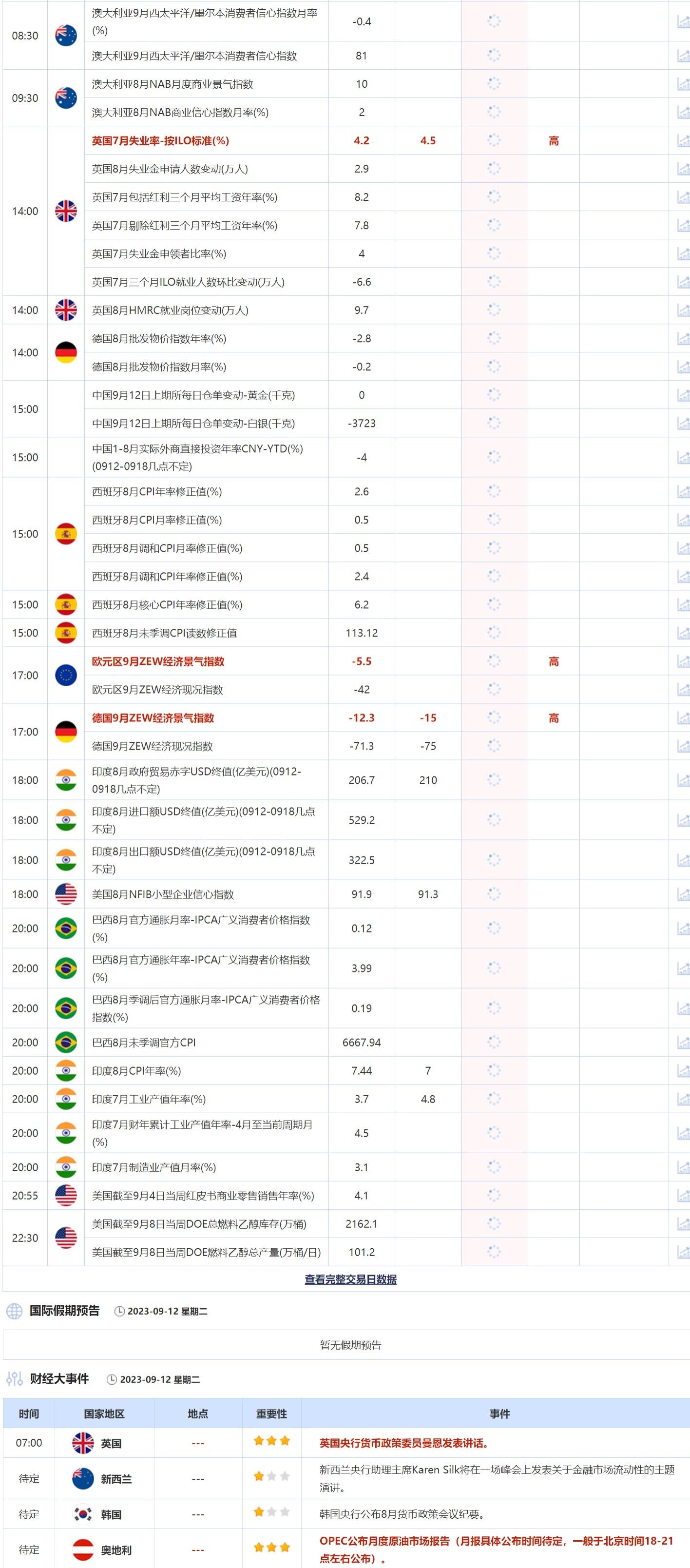 9月12日,投资者需要关注的重点数据:英国7月失业率-按ILO标准,欧元区9月ZEW经济景气指数,德国9月ZEW经济景气指数。需要关注的大事:英国央行货币政策委员曼恩发表讲话,OPEC公布月度原油市场报告。