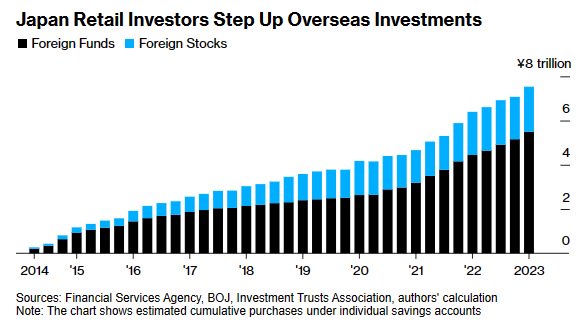 一直在向海外股票和基金投入大量资金的日本散户投资者预计将在2024年加大海外投资力度,这将推动日元的抛售,因为日本政府将永久取消对一种非常受欢迎的个人投资账户的股息和交易利润征税。