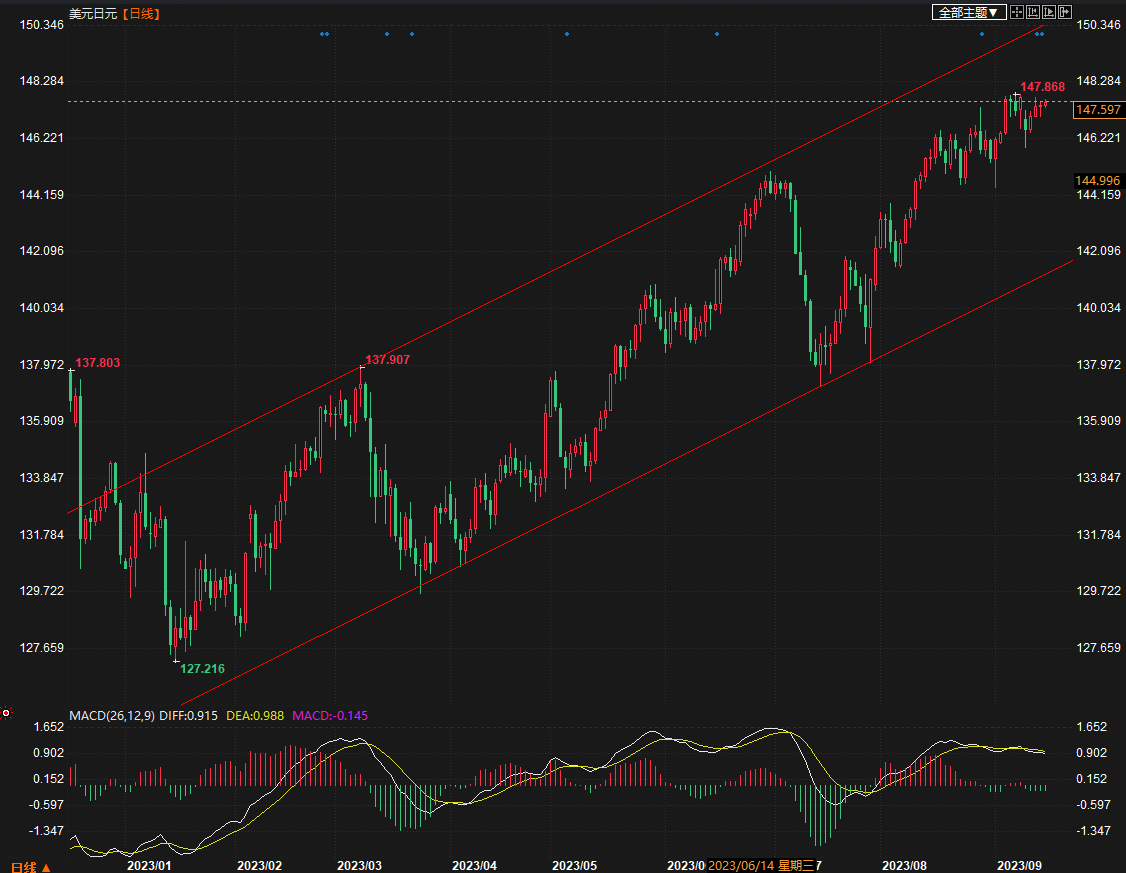 预计未来美元兑日元货币对将出现波动。而波动的可能方向,仍然是继续向上。北京时间14:54,美元兑日元报147.58/60。