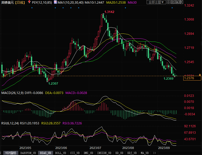 周一(9月18日),英镑兑美元收盘价与周五持平在1.2385,日内最低曾触及1.2371美元。周一交易清淡,市场波幅不大。交易员们周一正在等待本周晚些时候可能撼动汇市的几项央行利率决定。交易员认为,英国央行周四将上调利率25个基点至5.5%,这可能是本轮紧缩周期的最后一次加息。因英国劳动力市场和经济以及欧元区经济放缓,已不允许英央行继续有太大空间提升利率了。而反观美国,由于其经济表现优于全球大部分国家,从而趋势交易员有非常强烈的共识,认为可能从利率点阵图中能看到美联储一些鹰派立场。也就是说在英镑与美元利率即便持平的情形下,考虑到美国经济的良好表现,美元的吸引力都将会盖过英镑。日线图上,镑美继续沿布林带通道下轨线下行,短线也显现不出一丝反弹整理的欲求。恐怕英镑/美元逃不脱逢高被沽售的交易节奏。