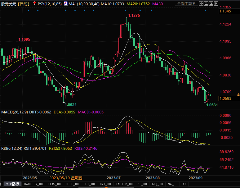 周一(9月18日),美元兑一篮子货币周一回落,但仍接近六个月高点,市场交投清淡,交易商在等待美联储、英国央行和日本央行本周公布利率决定。欧元兑美元继续略微上涨0.23%,报1.0683美元。美国经济增长的韧性推动美元在最近几周反弹,但这波涨势可能会受到一系列数据和周三美联储利率决定的考验。周一的数据显示,由于高利率削弱了潜在购房者的承受能力,9月美国住宅建筑商信心连续第二个月下滑,乐观情绪降至4月份以来最低。数据将有可能令美联储本周的利率会议上继续按兵不动。有权威人士分析认为,从点阵图来看,风险天平确实会略偏鸽派,但这应该不会显著影响美元的长期看涨趋势,因为外汇市场显然关注相对增长动态,而美国迄今为止仍然是糟糕的10国集团(G10)中表现最好的国家。目前欧元兑美元也仅显示出一种超买整理的走势行情之中,从日线图上观察颇有下跌旗形整理之嫌,也就是说若无重大利好,欧元/美元较大概率将维持下走趋向。