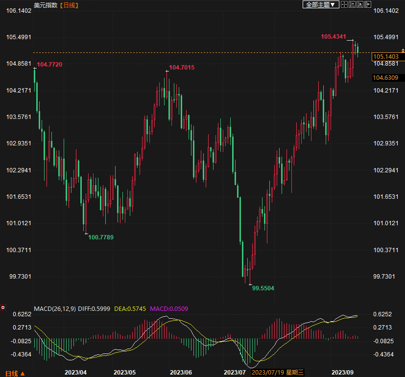 衡量货币兑六种主要货币的美元指数现报105.08,下跌0.27%,但仍接近上周四触及的六个月高点105.43。该指数上周连续第九周上涨,这是近十年来最长的连续上涨趋势。