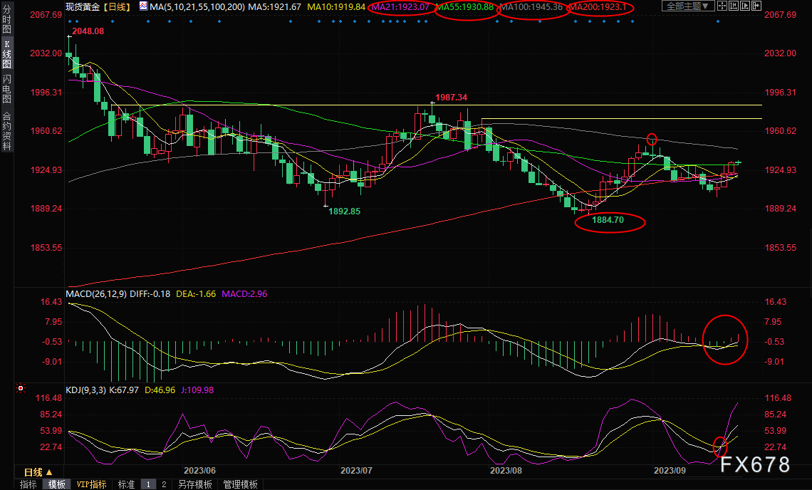 日线级别:震荡;MACD重新结成金叉,KDJ金叉良好运行,金价攻克200日均线后初步攻克55日均线,短线看涨信号有所增强,有望进一步试探100日均线1945.36附近阻力,进一步阻力参考9月1日高点1952.79附近位置,若能顶破该阻力,则增加中线看涨信号。