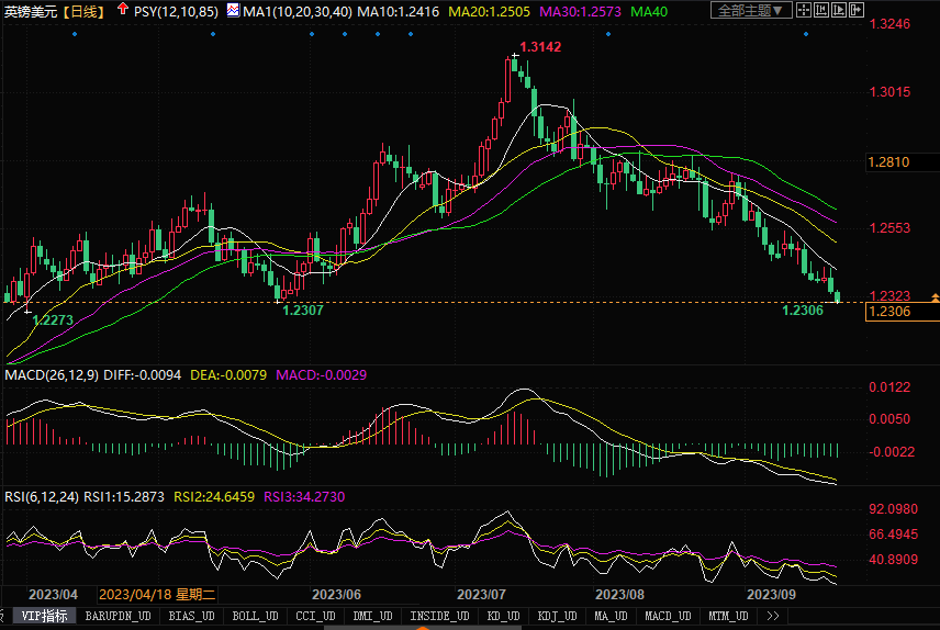 周三(9月20日),受美联储当日在利率会议上的鹰派表态影响,英镑兑美元走势震荡,纽约尾盘下跌0.28%,至1.2345收盘,盘中曾跌至近四个月低点1.2329水平。之前公布的数据显示,英国8月消费者物价指数(CPI)同比涨幅意外降至6.7%。接受路透访查的经济学家此前预计,8月CPI同比涨幅将从7月的6.8%上升至7.0%。汇丰银行欧洲外汇研究主管Dominic Bunning表示,核心通胀和服务业通胀回落尤其会带来一些安慰,并将英国央行周四加息幅度限制在25个基点,这将标志着本轮加息周期达到顶峰。利差带给英镑的支撑因素将渐渐消散。为此,英镑/美元当前显露出一路下行的姿态。一旦1.23也失守,今年年头曾见过的低水位1.20-1.19价位区域将遭到威胁。上方1.25水平附近构成初步的阻力所在。