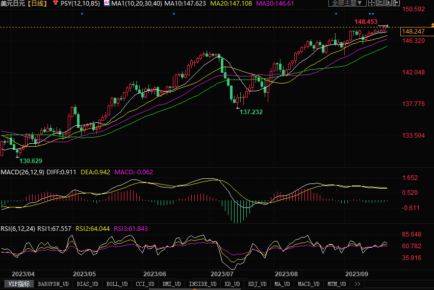 周三(9月20日),美联储虽然9月此次利率会议跳过加息,但未来的利率前瞻指引却越发表露鹰派的态度,驱使美元兑日元继续闯高,当日高收盘在148.34。日本财务省财务官神田真人周三再次警告称,日本当局始终与美国和海外政策制定者就汇率问题保持密切沟通,同时以“高度的紧迫感 ”密切关注市场走势。周二在被问及美国是否会像去年那样对日本当局入市干预阻贬日元表示理解时,美国财政部长叶伦称这要取决于具体情况。看来日本政府今年若要实施干预,似乎还要仰人鼻息,前提是要得到美国方面的首肯,或许才能大胆干预。本周五,日本央行也将召开利率会议,若仍是无所作为维持货币宽松不变。那么势必推动美元/日元继续往高处攀爬,上年150-151的高位区域将落入美元多头冲击的目标。短线若日本方面无干预出现,即便有获利性的调整,美元兑日元料回落的幅度也将是有限的,下方当前阶段强支撑在145水平附近。