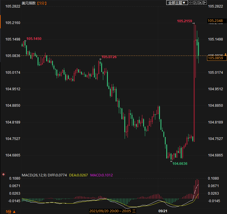美元指数DXY短线涨幅扩大至47点,报105.20。欧元兑美元EUR/USD短线跌幅扩大至54点,报1.0673。美元兑日元USD/JPY短线涨幅扩大至54点,报148.11。美联储利率决议公布后,现货黄金短线下挫6美元,报1940.31美元/盎司。