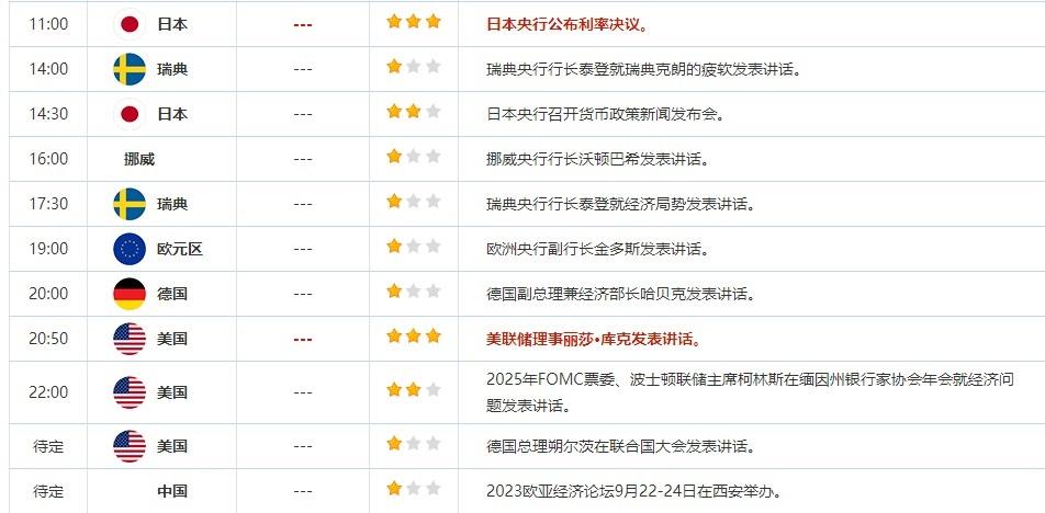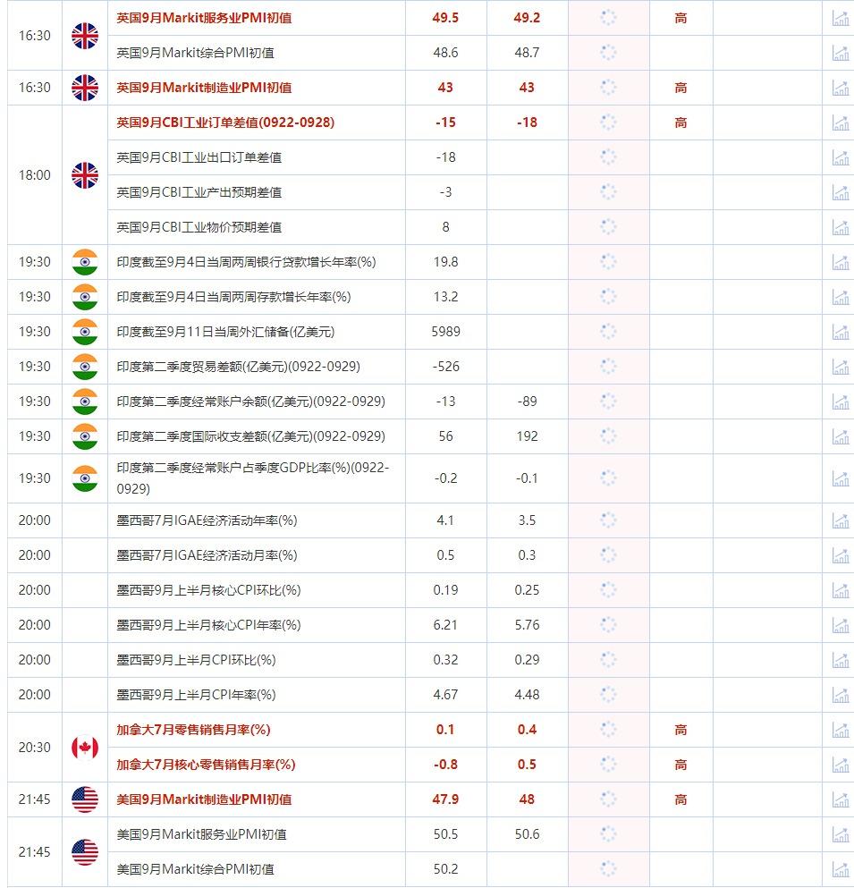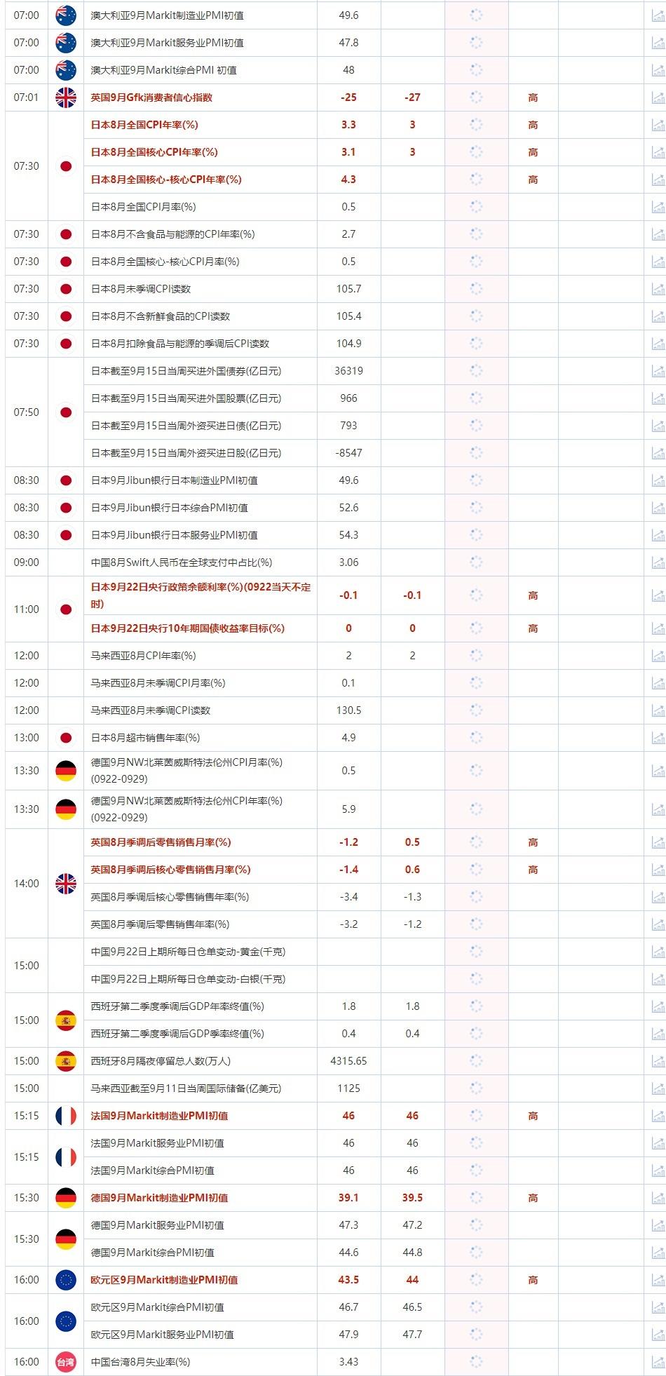 9月22日,投资者需要关注的重点数据:新西兰8月贸易帐,英国9月Gfk消费者信心指数,日本8月CPI,英国8月季调后零售销售月率,欧元区9月Markit制造业PMI初值,英国9月CBI工业订单差值,加拿大7月零售销售月率,美国9月Markit制造业PMI初值。需要关注的大事件包括日本央行利率决议,美联储理事丽莎·库克发表讲话。