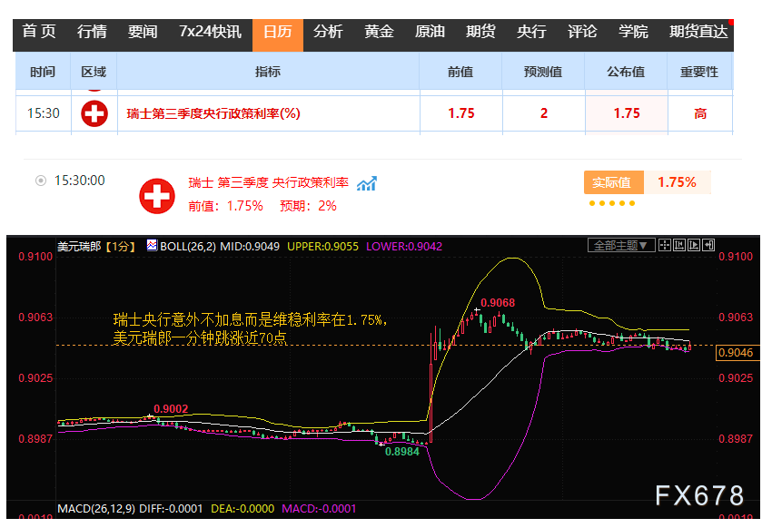 今日(9月21日周四)15:30,瑞士央行宣布利率决议,意外宣布维稳在1.75%,此前市场预期的加息25个基点至2%的预期落空,瑞郎全线急跌几十点,且大部分行情在一分钟内完成,其后稍有延续然后陷入震荡。