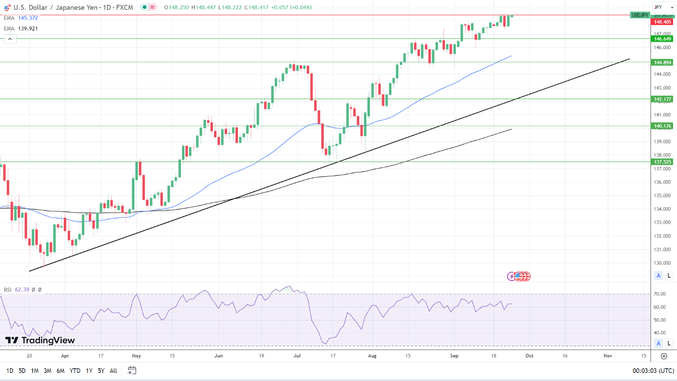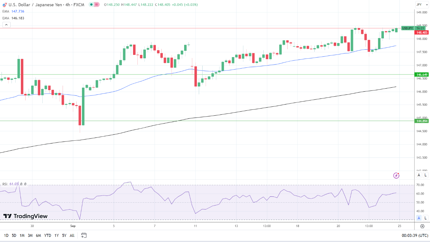 14-4小时RSI读数62.30支持美元/日元突破148.405阻力位,然后进入超买区域。