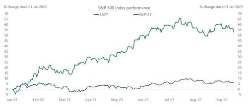 正如Torsten Slok在他最新的Daily Spark文章中指出的那样,标准普尔500指数中最大的7只股票在2023年上涨50%以上,其余493只股票基本持平。最重要的是,如果投资者今天购买标准普尔500指数,基本上是在购买少数占该指数34%且平均市盈率在50左右的公司。