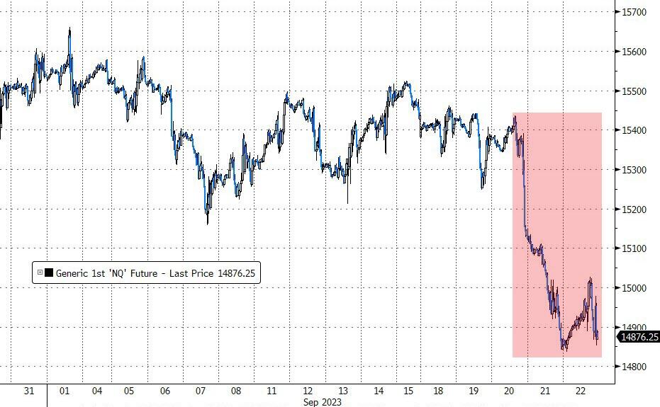 托尼提到,在经历了这几个月虚张声势的软着陆希望之后,美联储认真对待长期走高的问题,美国股市乘电梯下降了,罗素2000指数和同等权重标准普尔500指数今年迄今的升幅几乎被抹去。