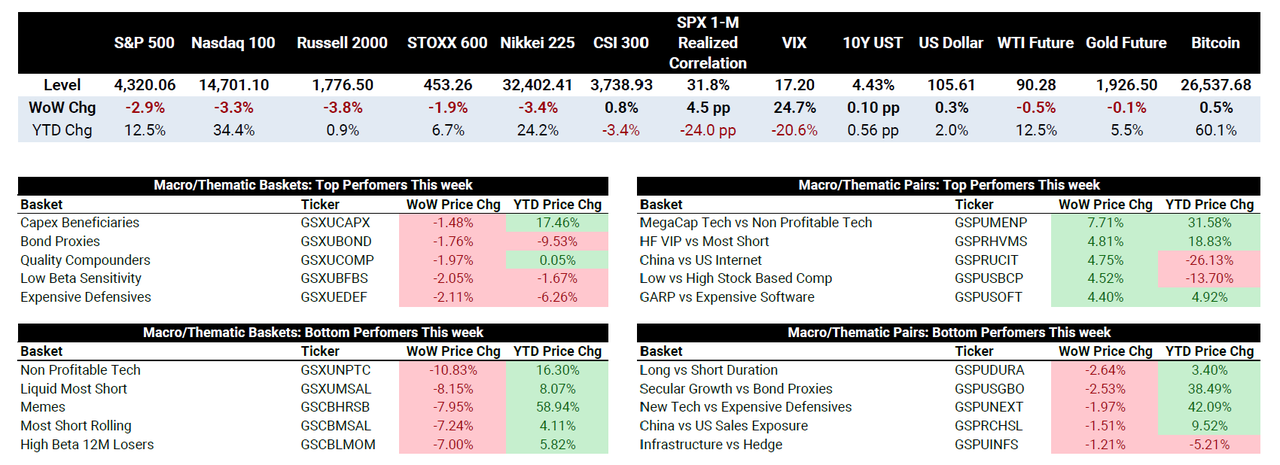 高盛报告提到,美国股市上周普遍下跌,标普500指数最终下跌2.9%,原因是债券收益率触及新高,这是对明年修订后的点阵图的反应,该图意味着联邦公开市场委员会(FOMC)此前表示的降息幅度较小。债券代理、优质增长和低贝塔股票表现优于大盘,而非盈利科技股、最短股票和高零售情绪股票则表现最差。