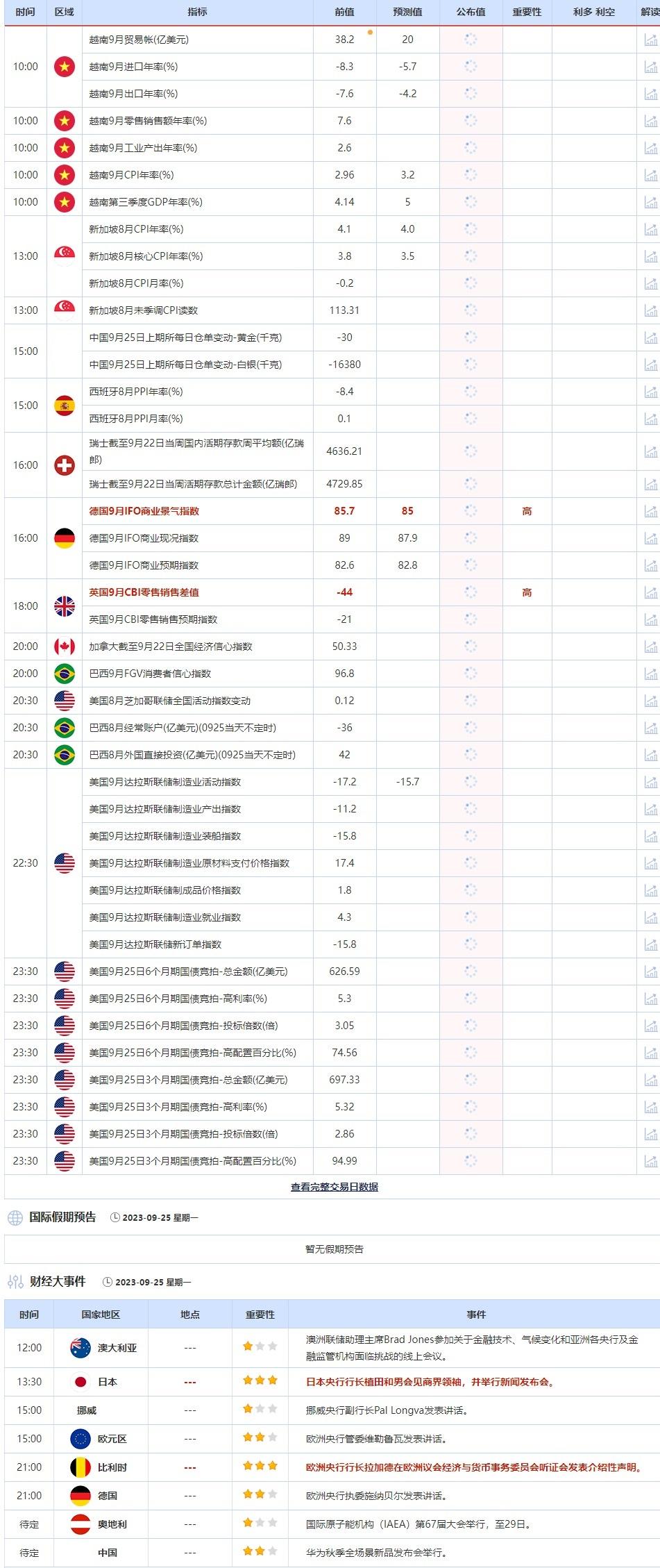 9月25日,投资者需要关注的重点数据: 德国9月IFO商业景气指数,英国9月CBI零售销售差值。需要关注的大事件包括日本央行行长植田和男会见商界领袖,并举行新闻发布会;欧洲央行行长拉加德在欧洲议会经济与货币事务委员会听证会发表介绍性声明。