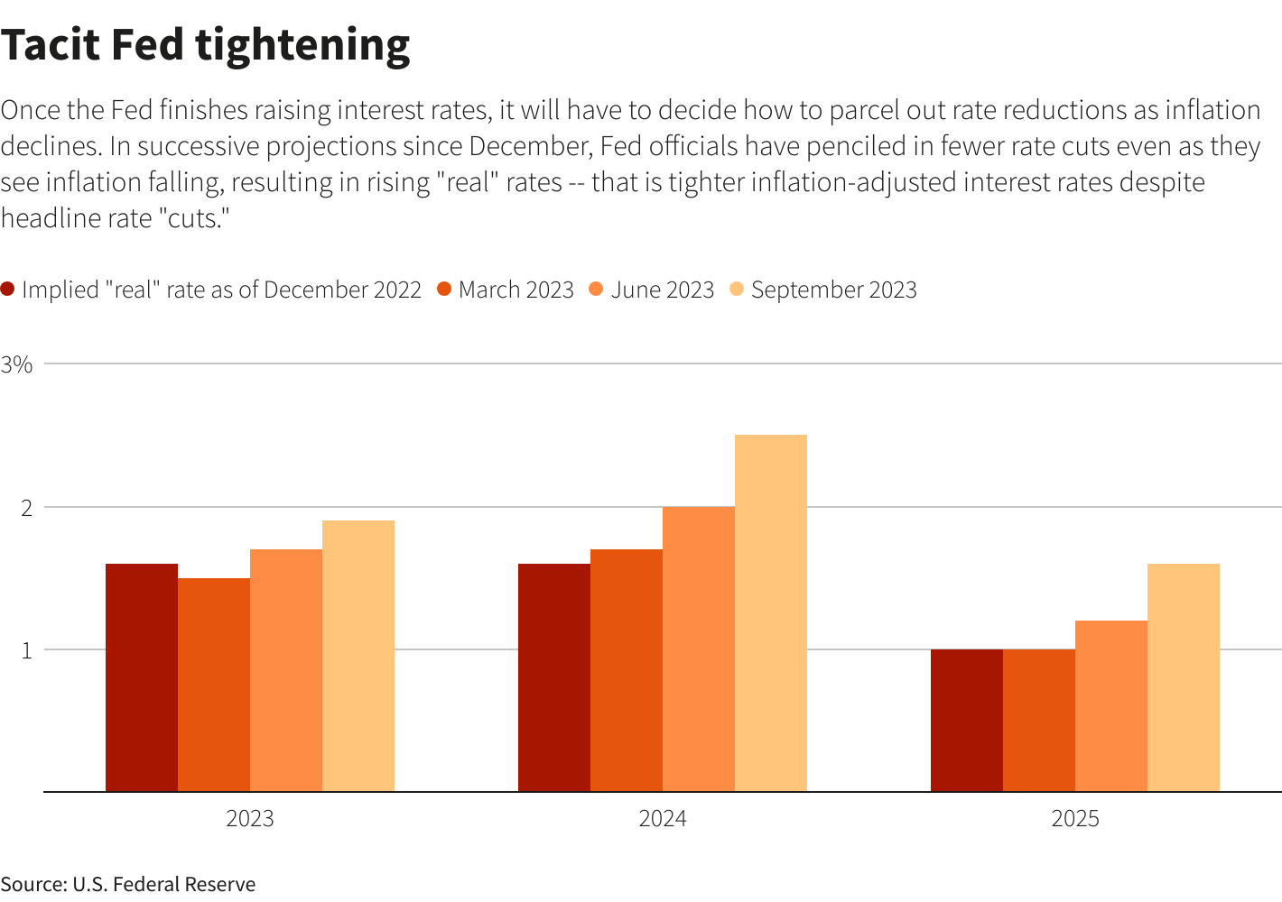 他们还计划在通胀真正达到目标之前就开始降息,以防止在通胀下降的情况下政策变得过于严格。美联储最新的季度预测表明,他们现在认为需要更高的通胀调整后的“实际”利率来充分抑制经济并赢得通胀之战。