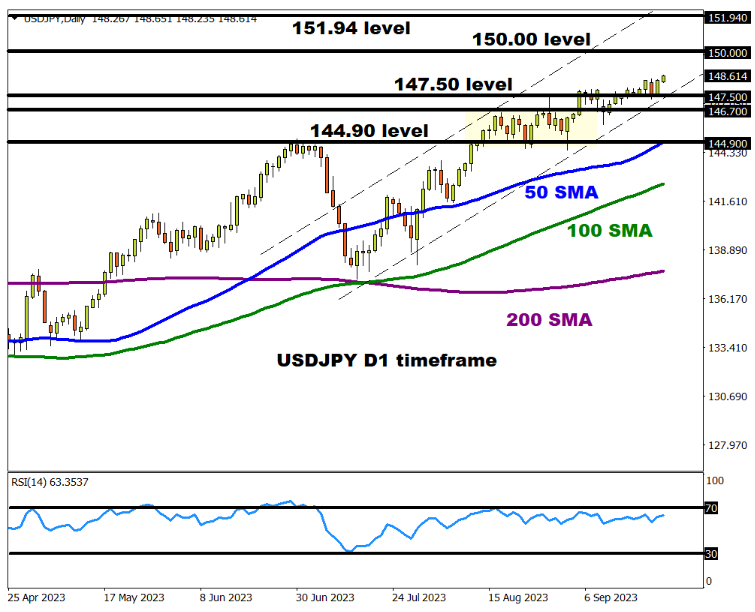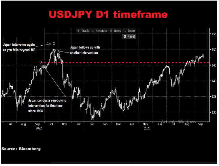 上周的联邦公开市场委员会会议结束时,鲍威尔表示利率将“在更长时间内保持在较高水平”。如果政策制定者采取强硬语气并强化上周的信息,随着围绕美联储2023年再次加息的预期上升,美元兑日元可能会走高。