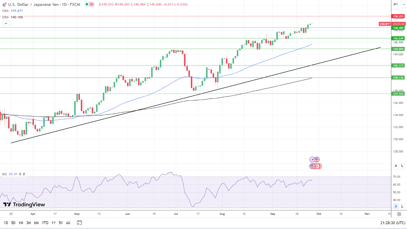 14日RSI显示为65.41,支撑美元/日元在进入超买区域之前升至150.293阻力位。