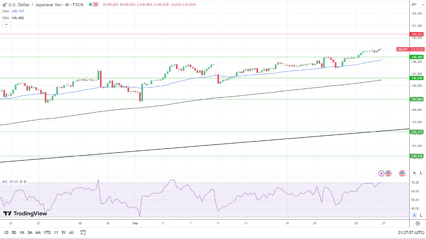 4小时图看,美元/日元仍高于50日和200日均线,重申看涨价格信号。美元/日元突破149.186将支撑其在150.293阻力位运行。