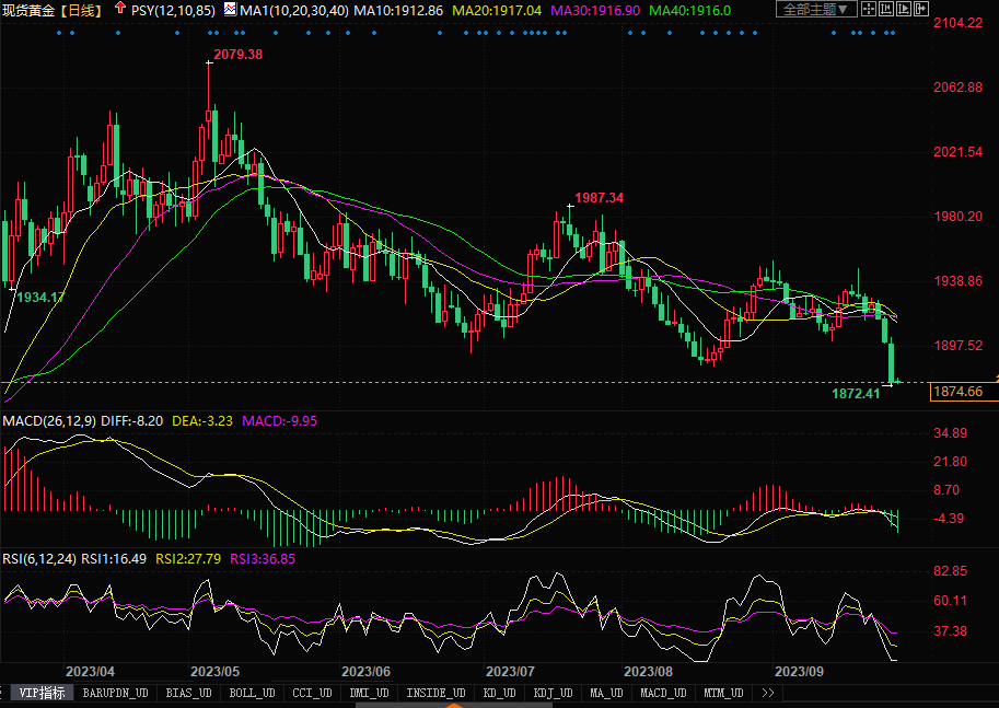 周三(9月27日), 随着美元和美债收益率双双攀升,黄金继续遭受重创,日内彻底跌穿1900和前期强支撑1880关口,盘中最低一度触及三个月以来的低点1872美元,最后也低收盘在1874.57美元水平,全日跌幅达1.35%。