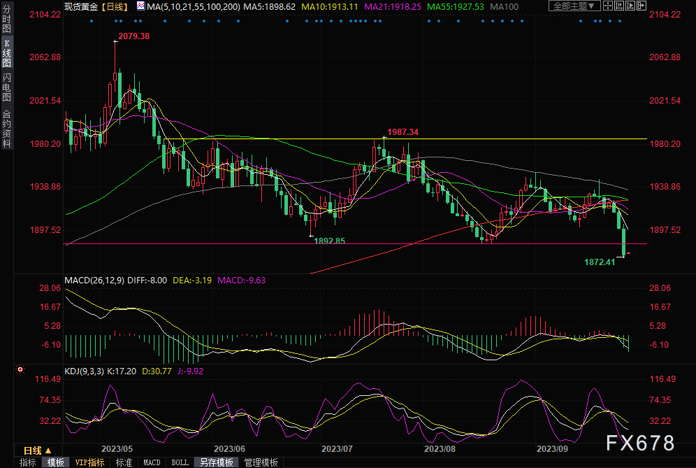 现货黄金收跌1.35%,收报1874.82美元/盎司,盘中最低曾触及1872.41美元/盎司,为3月13日以来新低。