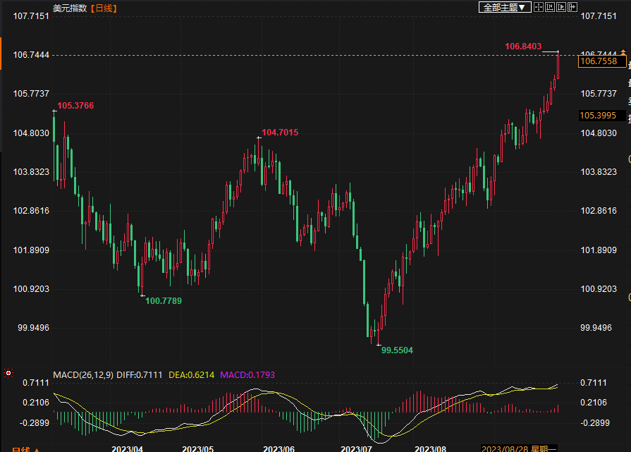 周三(9月27日)美市时段,美元触及10个月高点,推动欧元跌至近9个月低点,并保持日元处于干预区间,因为投资者押注美国经济在利率高于竞争对手的情况下会表现得更好。截至发稿,美元指数106.81,日内涨幅0.59%。