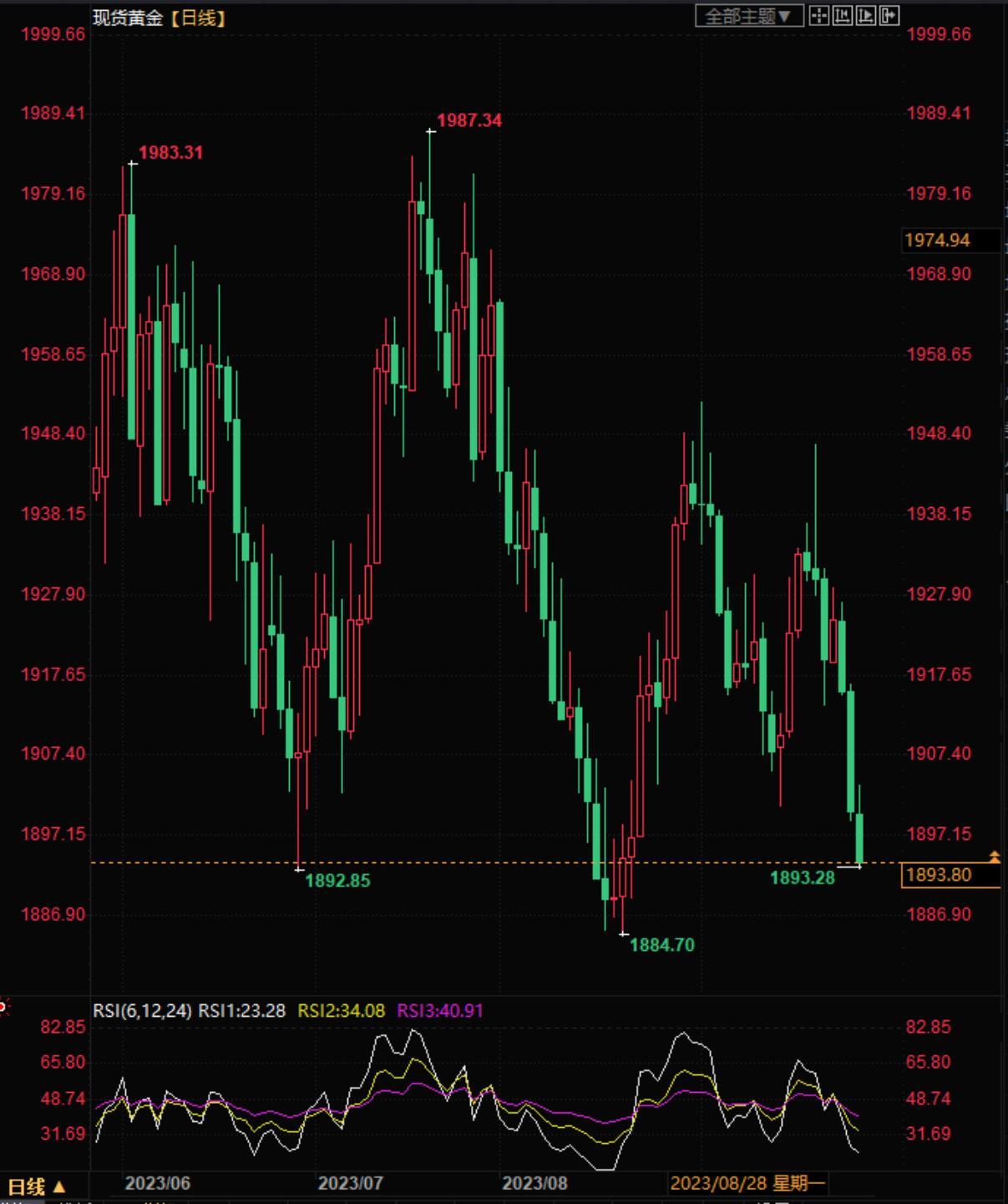 在下行方面,随着金价跌破1900美元/盎司,金价可能进一步跌向8月21日低点1885美元/盎司。金价下一下行目标位于1970美元/盎司的静态支撑位。