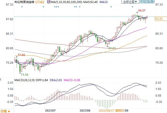 布伦特原油连续日线图北京时间9月27日15:27,布伦特原油连续报92.89美元/桶