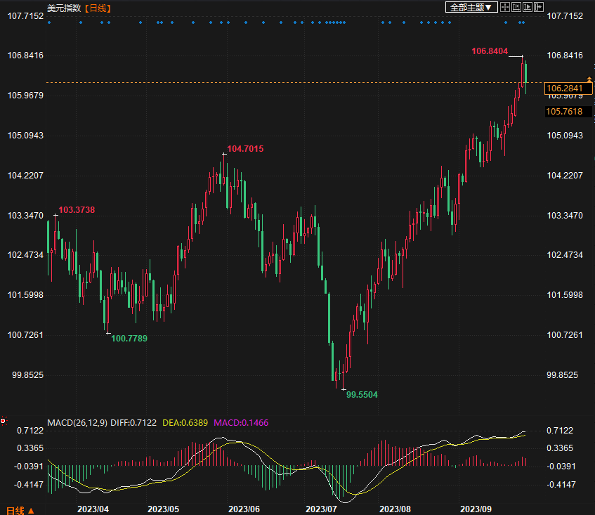 周四(9月28日)美市时段,美元指数从10个月高位回落,但仍有望实现每周上涨。而日元/美元汇率接近11个月低点,投资者对日元可能受到的干预保持警惕。截至发稿,美元指数106.25,日内跌幅0.42%。