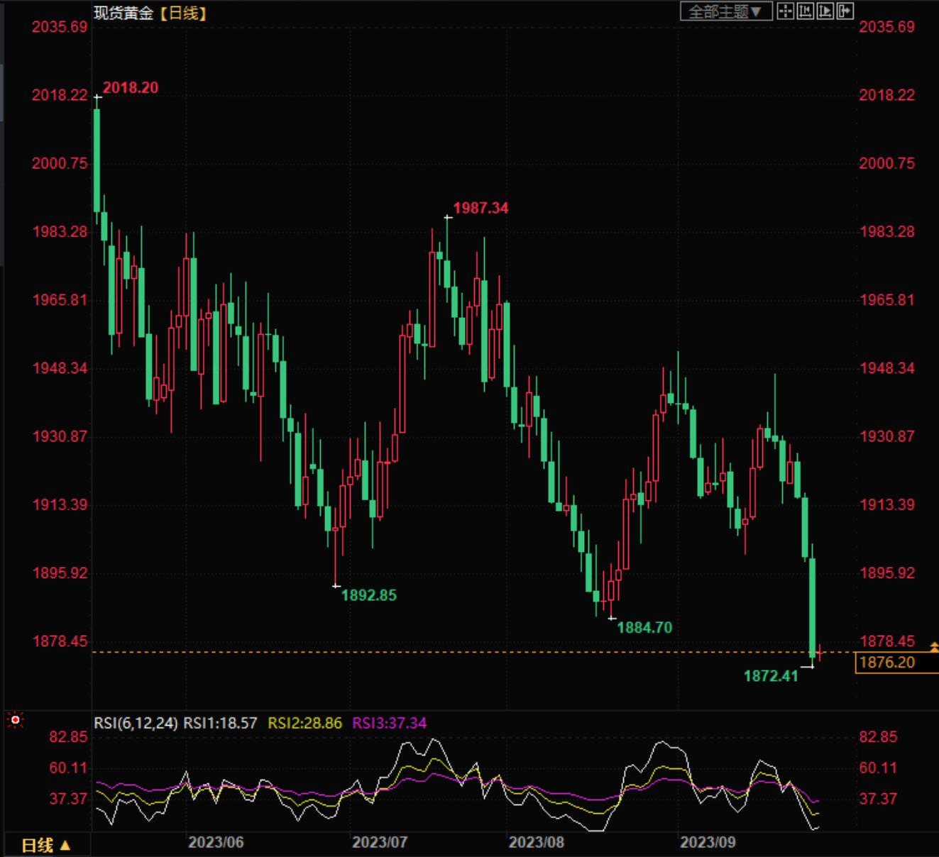 在连续三日重挫后,现货黄金日内低位盘整,再度逼近1870美元,周三下跌1.4%,为7月以来的最大单日跌幅。