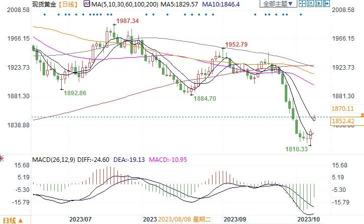 现货黄金日线图北京时间10月9日12:30,现货黄金报1852.25美元/盎司
