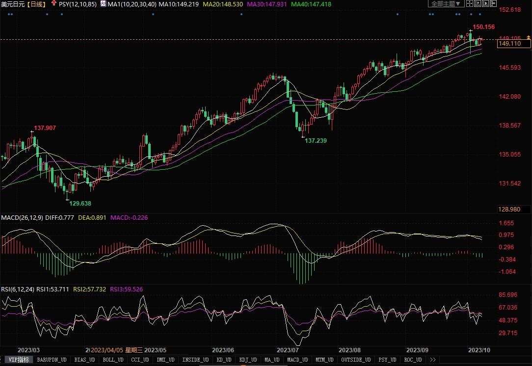 上周五(10月6日),美元兑日元上涨0.54%,报149.31仍徘徊在150日元关口附近。上周五美国公布强于预期的非农就业数据后,美国利率期货走势显示,市场预计美国联邦储备理事会(FED/美联储)年底前加息可能性为42%,高于周四的约33%。美国公债的快速抛售,收益率升至多年高点,指标10年期公债收益率达到4.887%,30年期公债收益率达到5.053%,均为2007年以来最高,而两年期公债收益率最高升至5.151%,维持在9月21日创下的5.202%水平之下。对公债收益率变化敏感的美元/日元的交易,直至当前仍受着收益率差的影响,美元仍无转弱的迹象显现。只是在接近150警戒水平之际,交易员一直在防范日本央行可能的干预而导致汇价显得有点逡巡不前。近期还是要密切留意150水平的压制情况,若不能冲破,则需谨防调整回落的风险。