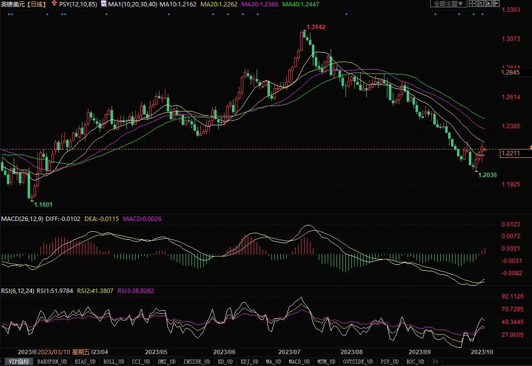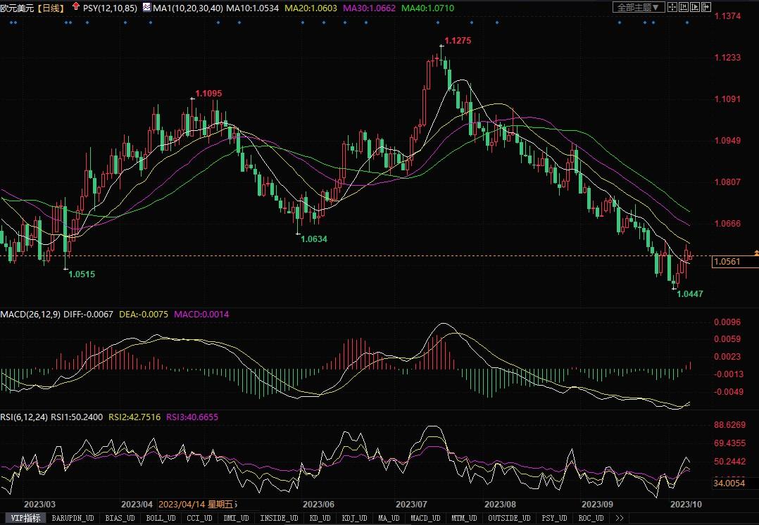 上周五(10月6日),美元兑一篮子货币周五下滑,原因是投资者对周五的就业报告进行了评估,该报告显示,9月份美国各行业就业岗位普遍增加,但薪资增长在放缓。数据显示上个月美国非农就业岗位增加了33.6万,月度薪资增长依然温和,9月平均时薪环比升幅为0.2%,同8月份涨幅一致,在截至9月份的12个月中,薪资增长了4.2%,而8月份为4.3%。数据将首次降息的预期进一步推迟至2024年底,但未能说服市场参与者预计今年再次加息,这意味着在推动外汇走势方面发挥着主导作用的短期收益率保持相对稳定,但其推动美元升高的势能有所下降。欧元兑美元自周初触碰年内低点1.0448之后,连续多日展开了反弹,上周五一度借美国就业数据之机反弹回升至两周来的高位1.06附近,但收盘阶段仍低于1.06之下。接下来,市场的焦点将转向本周的美国通胀数据,如果美国消费者物价数据进一步推高收益率,那么美元仍会得到强力支撑。日线图上,欧元/美元仍受压于20日均线下方,虽然技术指标出现超卖调整姿态,但汇价整体尚未能摆脱下行的风险,只有看到汇价重回1.0650之上,或才有望缓解极度下滑的势头。
