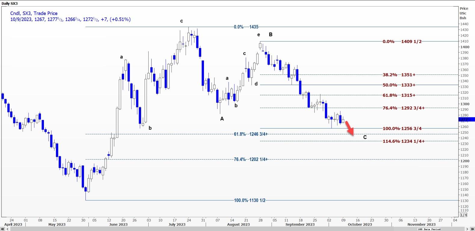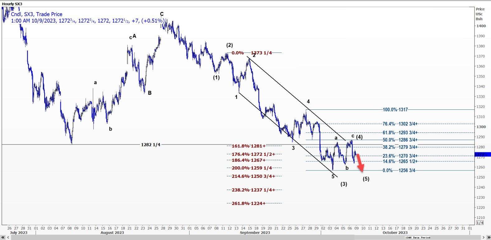 从1256.75美分开始的(4)浪已在1286.75美分阻力位附近完成。下降趋势已经恢复,乘着波浪(5)至少可能达到1256.75美分。