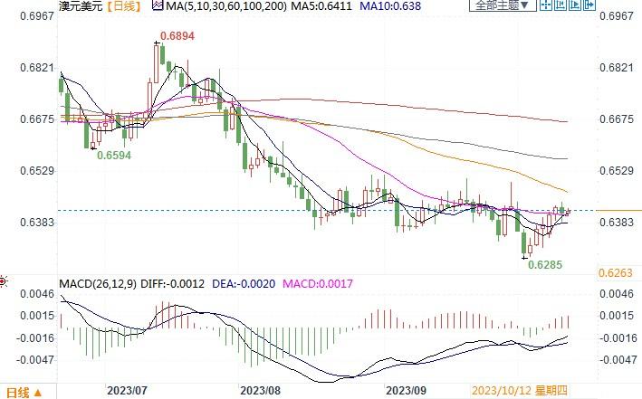 周三(10月11日),澳元兑美元有所回落,收盘在0.6413,但仍巩固住近期对美元的反弹涨势。澳新货币的反弹很大程度上归功于一些官员的评论,他们认为美国的利率可能已经见顶,这促使公债收益率回落。但是,来自澳洲央行的声音似乎很乐意继续暂停加息。为此,市场对澳洲央行再次加息的预期逐步减弱,目前认为澳洲央行在11月的下次会议上上调4.1%隔夜拆款利率的可能性仅为14%。而美元的利率前景仍处在模糊不清的状况之中,因此澳元想要获得继续上冲的动能似乎存在着较大的阻碍。留意晚间美国CPI通胀数据情况,若增长低于预期和前值,澳元/美元或有望上冲一线逼近布林带通道上轨线0.6485-0.6500价格区域。相反,若美CPI数据意外超强,不言而喻澳元恐会遭到抛压的打击。