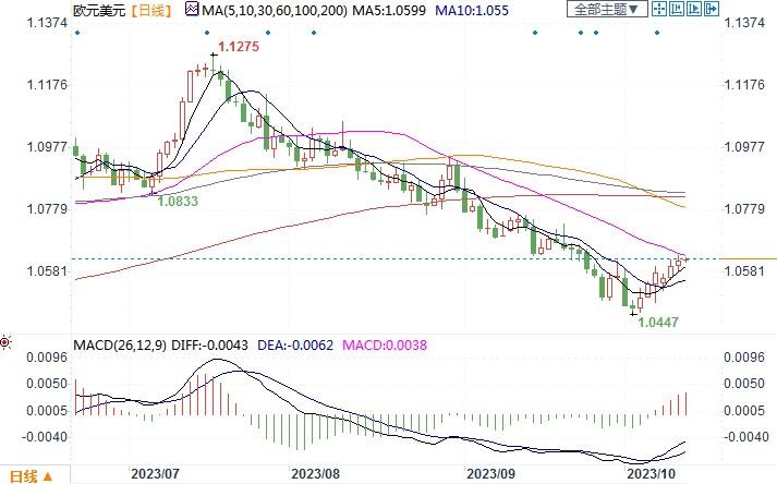 周三(10月11日),欧元/美元升至9月25日以来最高1.0634。周三当天美国公布9月份生产价格指数(PPI),剔除食品、能源和贸易服务后,9月核心PPI环比上涨0.2%,涨幅与8月份持平;9月核心PPI同比增长2.8%,增幅低于8月份的2.9%。9月通胀进一步放缓,导致市场推断美联储已完成加息。此外,当天公布的9月份美联储会议记录显示,美国经济走势的不确定性促使美联储官员在讨论是否需要进一步加息时采取谨慎立场。官员们变得更加担忧美国经济的下行风险。欧洲央行周三的一项调查显示,欧元区家庭认为通胀率将在未来三年内略高于欧洲央行2%的目标。荷兰央行总裁暨欧洲央行管委克诺特周三表示,欧洲央行在使通胀率回落至目标方面取得了“重要进展”,但前路依然漫长,不能排除进一步加息的可能性。消息面的纷纷扰扰,近段时间内停滞了美元走升的脚步,而诸如欧元这些主要非美货币获得了一定的低位反弹的动能。目前关键还要看周四美国的CPI通胀数据情况。数据的强弱将直接影响着欧元到底能继续延续反弹之势,还是将遭到抑制转而回落。