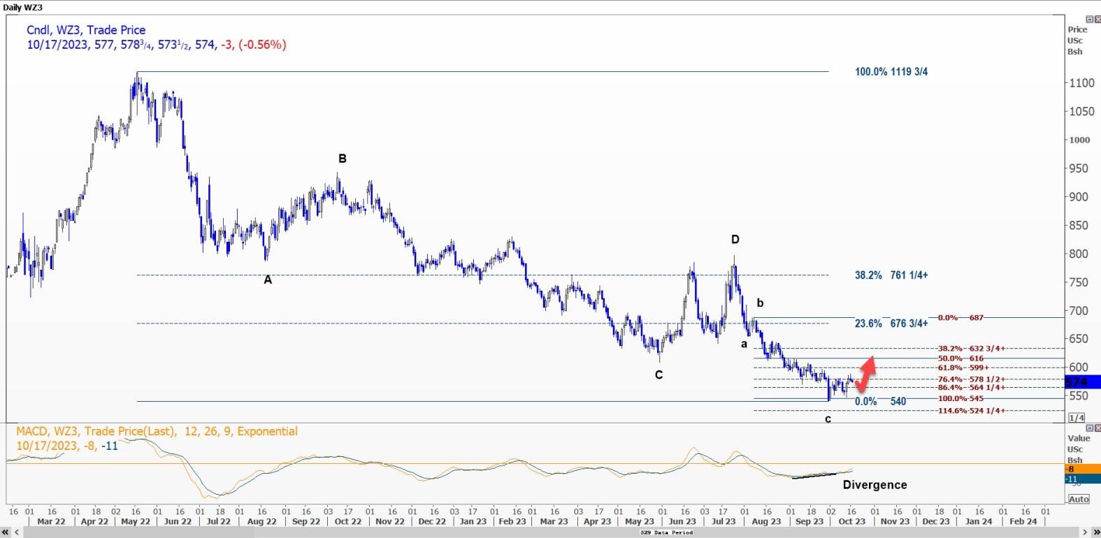 根据回撤分析,CBOT 12月小麦WZ3可能回撤至563美分/蒲式耳至567.75美分/蒲式耳的区间。