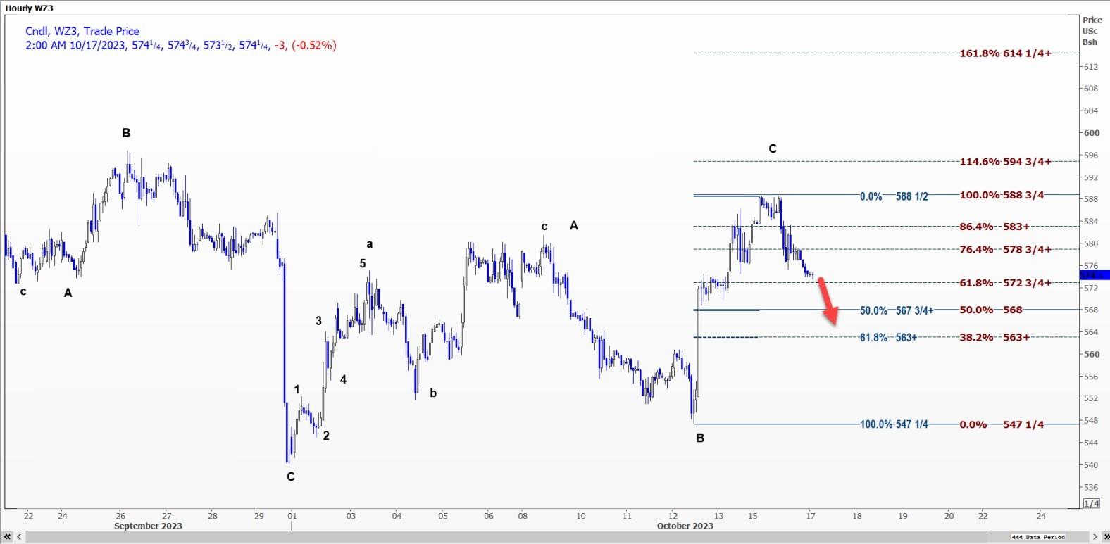 从547.25美分/蒲式耳开始的C浪似乎已在5.88.75美分/蒲式耳阻力位附近完成。从10月2日低点541.25美分/蒲式耳开始的上升趋势采用了锯齿形模式。