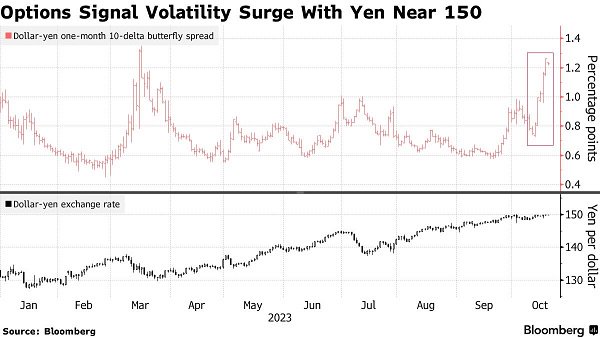 周四(10月19日)亚市盘中,美元/日元仍徘徊在150重要关口附近,期权交易员正在为日元交易的剧烈动荡做准备。