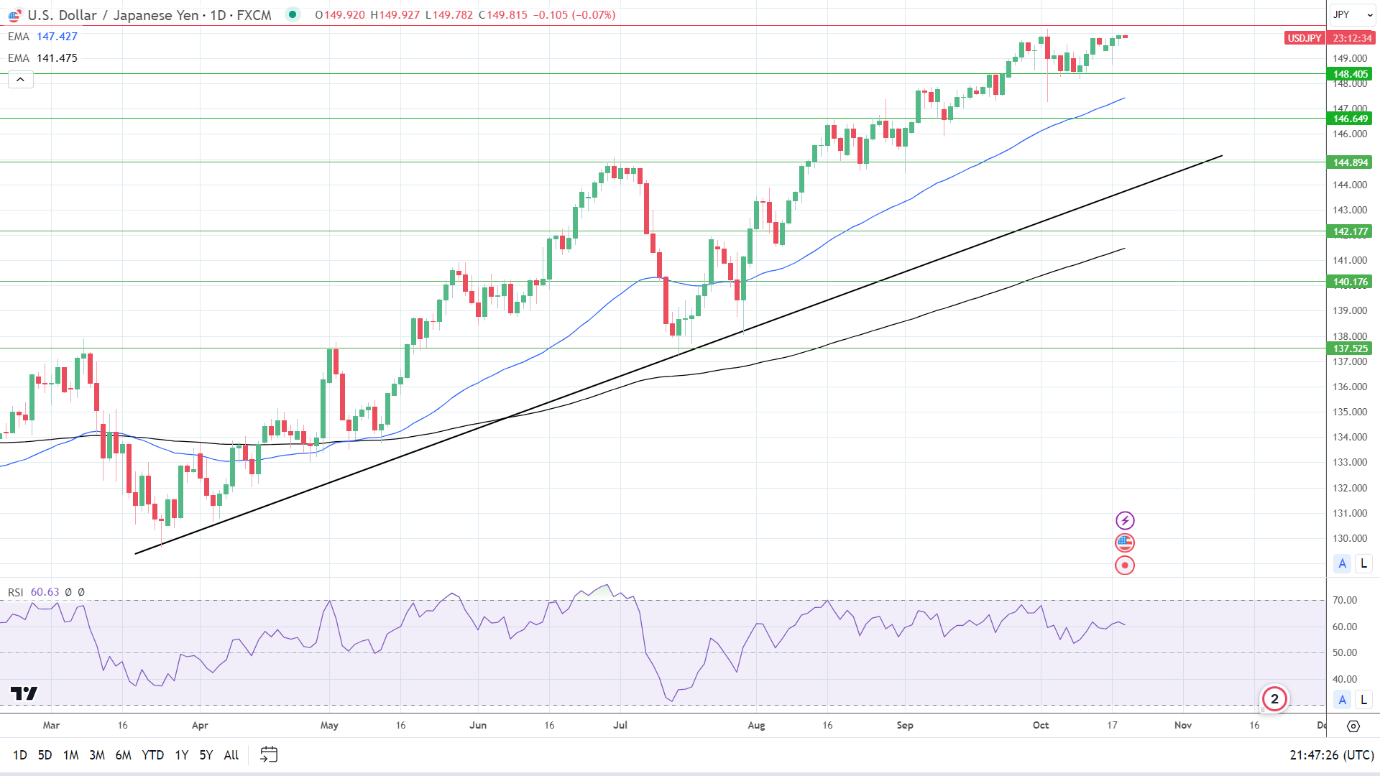 14天RSI位于60.63,支持美元/日元突破150.293阻力位,然后进入超买区域。