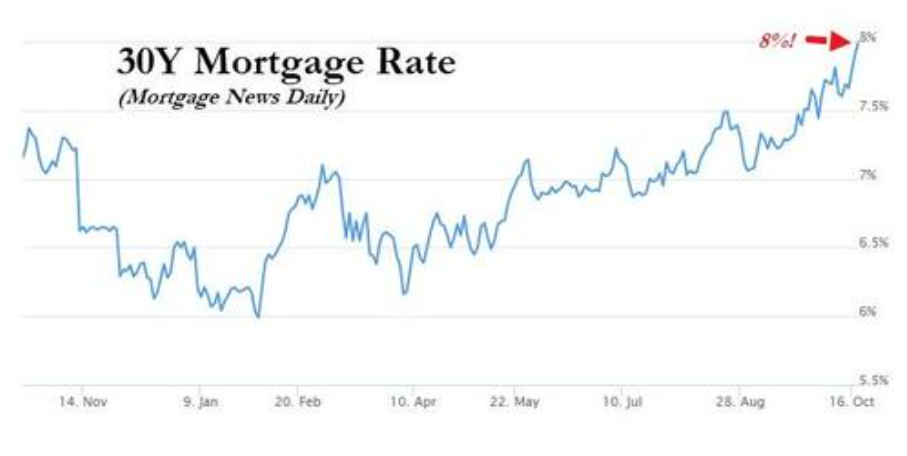 周三(10月18日),根据Mortgage News Daily的数据,市场流行的30年期固定抵押贷款利率的平均值达到8%,这是2000年中期以来的最高水平。