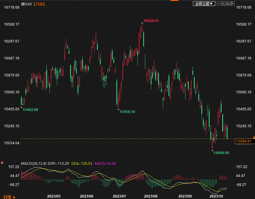 德国DAX30指数收盘下跌154.64点,跌幅1.01%,报15097.05点;