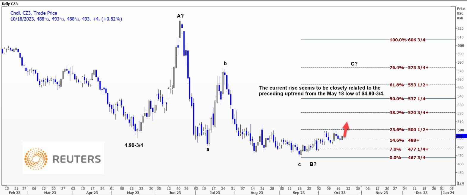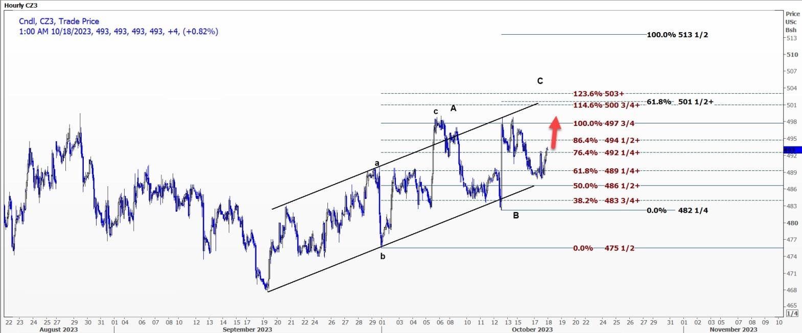这是一个非常规的发现,可能是不规则的公寓,价格为490.75美分/蒲式耳。根据这一数据,玉米正处于C浪中,该浪至少可能上涨至553.5美分/蒲式耳。