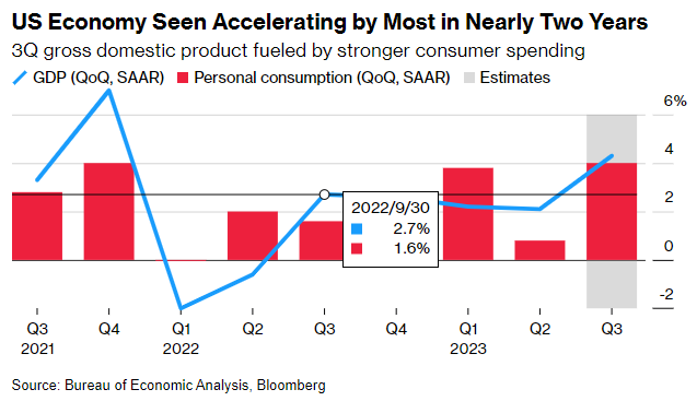 彭博社对经济学家进行的调查,预计美国国内生产总值(GDP)在7月至9月将以4.3%的年化速度增长。这种增长表明,相较于欧洲停滞不前和亚洲应对亚洲大国经济问题的情况,美国仍然是全球经济的强大引擎。