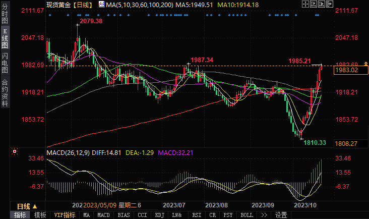 ——周五(10月20日)欧市盘中,现货黄金短线持续走高,金价刚刚触及1985美元/盎司,日内大涨逾10美元。
