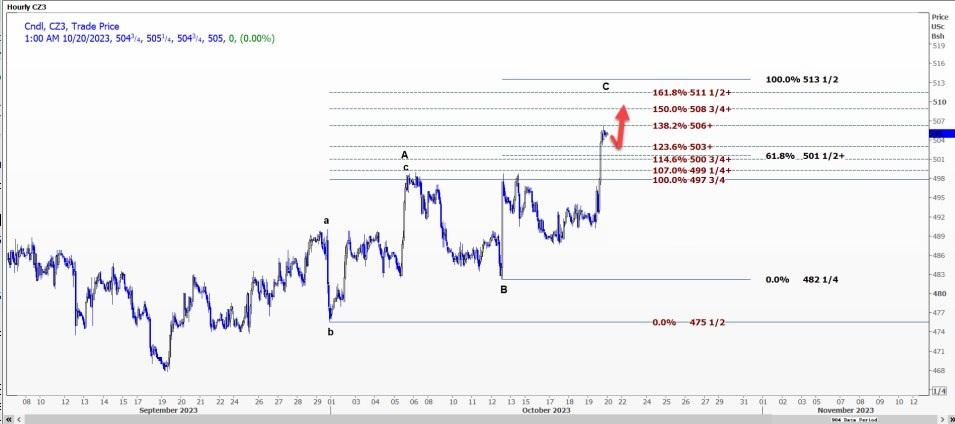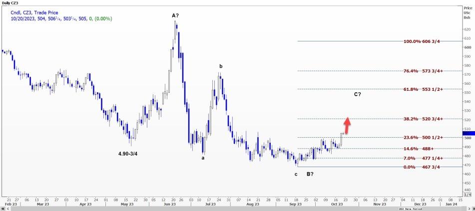 日线图上,该合约可能处于C浪上,这是490.75美分不规则横盘的第三浪。对这一波的预测分析显示突破了500.5美分的23.6%水平。